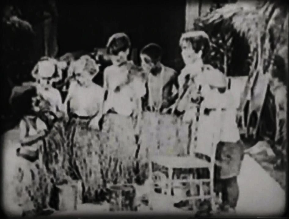 The gang takes refuge in the Cocoanut Grove, a room made up as a jungle but is closed for repairs. At this point the girls disappear, and the boys, except for Joe, are now dressed as cannibals in long grass skirts and face and body paint. They goof around, with Mickey, Jackie, and Farina trying to play various musical instruments, and Ernie, Jack, and Rondamere, circling Joe who is sitting in a pot as if waiting to be cooked. Then Joe gets out of the pot to smash coconuts with a hammer, and Farina takes his place. Joe then mistakes Ernie's head for a coconut, and there is about to be a big fight when Mickey shows them a pipe that they take as a peace pipe. They all smoke the pipe as if to make a truce.